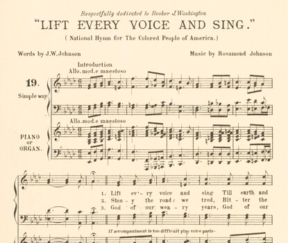 Image: A detail from the sheet music for James Weldon Johnson and J. Rosamond Johnson's “Lift Every Voice and Sing,” published by Jos. W. Stern & Co., New York, 1900 (Library of Congress)